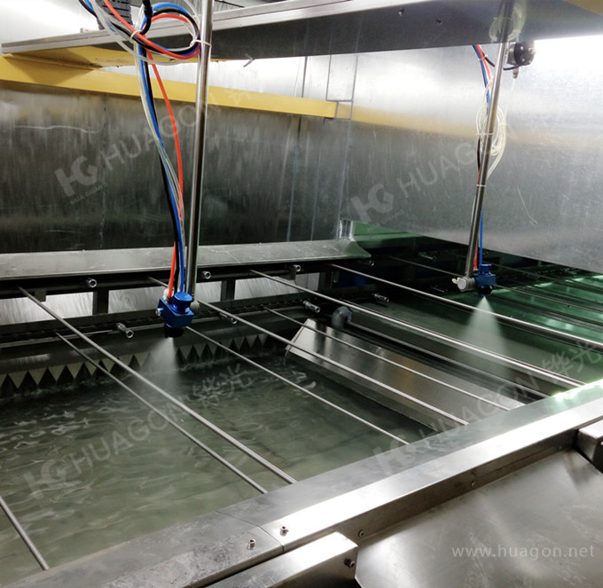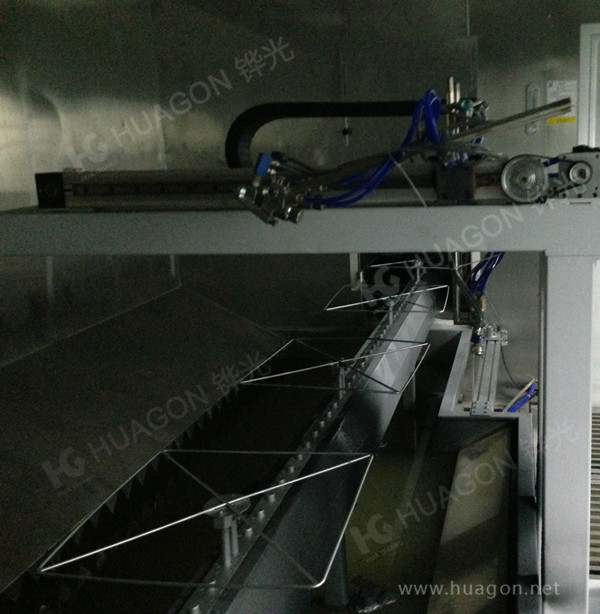 上料-手動靜電除塵-素材預(yù)熱-自動追蹤噴涂-靜置-隧道式烘烤-冷卻-下料